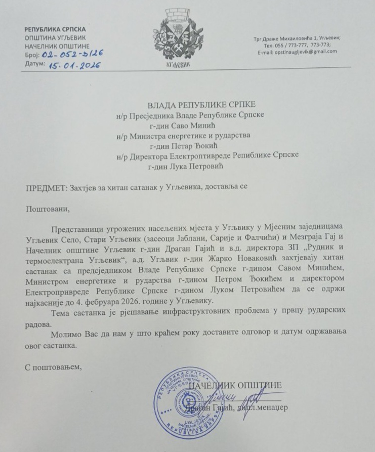 Predstavnici ugroženih naseljenih mjesta u Ugljeviku u Mjesnim zajednicama Ugljevik Selo, Stari Ugljevik (zaseoci Jablanj, Sarije i Falčići) i Mezgraja Gaj i načelnik opštine Ugljevik Dragan Gajić i v.d. direktora ZP „Rudnik i termoelektrana Ugljevik“, Žarko Novaković zahtijevaju hitan sastanak sa predsjednikom Vlade Republike Srpske Savom Minićem, ministrom energetike i rudarstva Petrom Đokićem i direktorom Elektroprivrede Republike Srpske Lukom Petrovićem da se održi najkasnije do 4. februara 2026. godine u Ugljeviku.